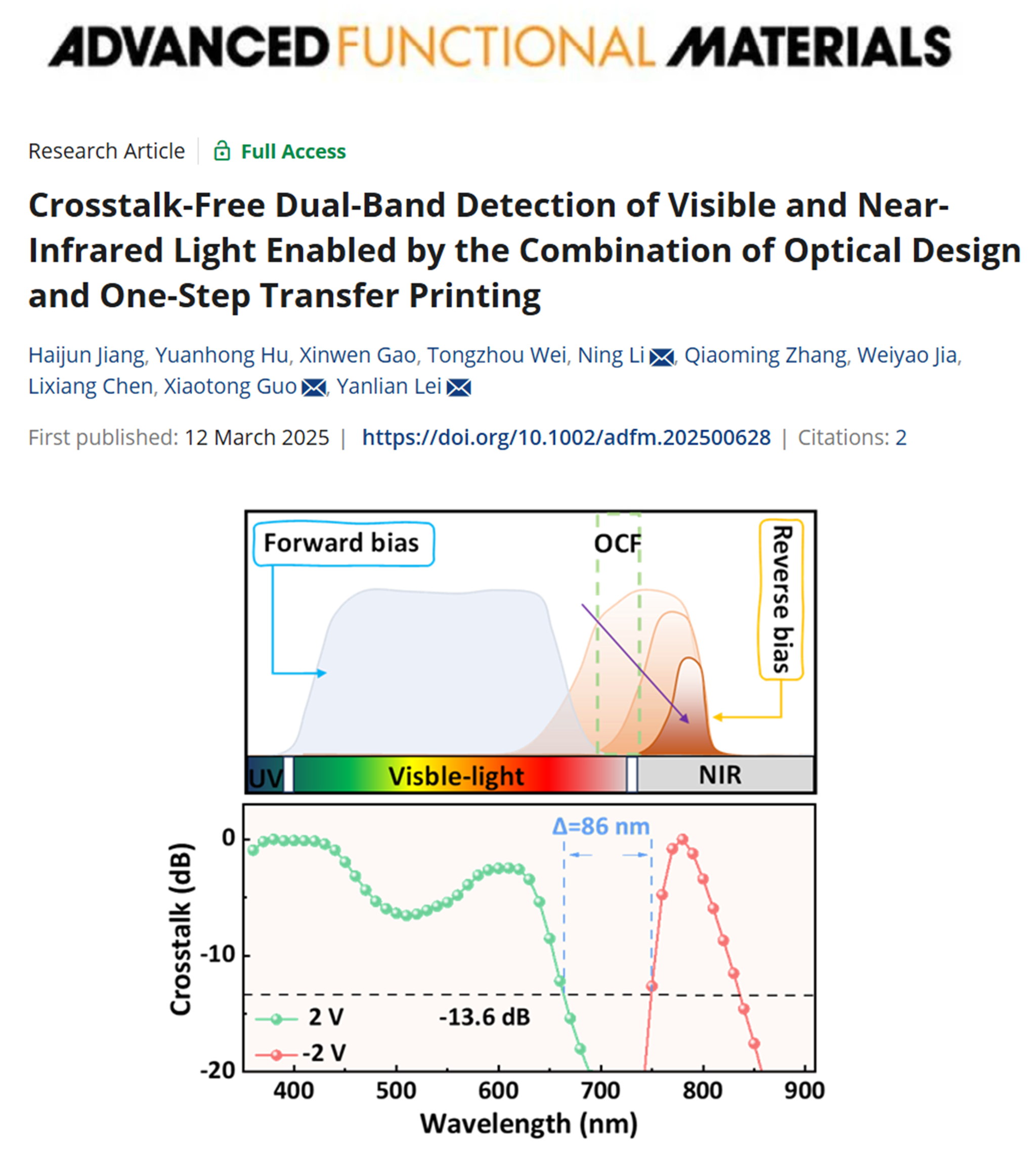 光学串扰会对图像识别和光通信等应用中的检测精度产生不利影响,是传统双波段光电探测器面临的一个关键挑战。针对这一问题,团队提出了一种通过垂直背靠背堆叠结构来消除双波段有机光电探测器中光学串扰的有效策略。该策略将用于短波长(可见光)吸收的异质结置于前侧,而用于长波长(NIR)吸收的异质结置于后侧。与以往通过增加前端单位厚度或增加光学间隔层的方法不同,团队利用一步转印方法增加后侧NIR吸收层的厚度。该技术不仅克服了溶液法制备有机厚膜的技术难题,还实现了双波段探测器中无串扰的光响应。基于器件内光场分布优化和电荷收集窄化机制,有效滤除了的短波长光的信号干扰,从而实现了在正向偏压下可见光和在反向偏压下窄带NIR光的独立检测。更重要的是,该方法适用范围广,不需要对吸收层进行特殊选择或设计,并成功验证了其在抗干扰信号检测和光通信中的应用,为未来开发无光学串扰多模光电器件提供了新思路。以上结果以“Crosstalk-Free Dual-Band Detection of Visible and Near-Infrared Light Enabled by the Combination of Optical Design and One-Step Transfer Printing”为题发表在《Advanced Function Materials》(2500628, 2025)上,大发快三 2022级硕士研究生蒋海军为该论文的第一作者,雷衍连副教授、南京理工大学李宁教授、重庆赛宝工业研究院郭小童博士为论文通讯作者,大发快三-大发快三平台-大发快三官网 (微纳结构光电子学重庆市重点实验室)为第一完成单位。