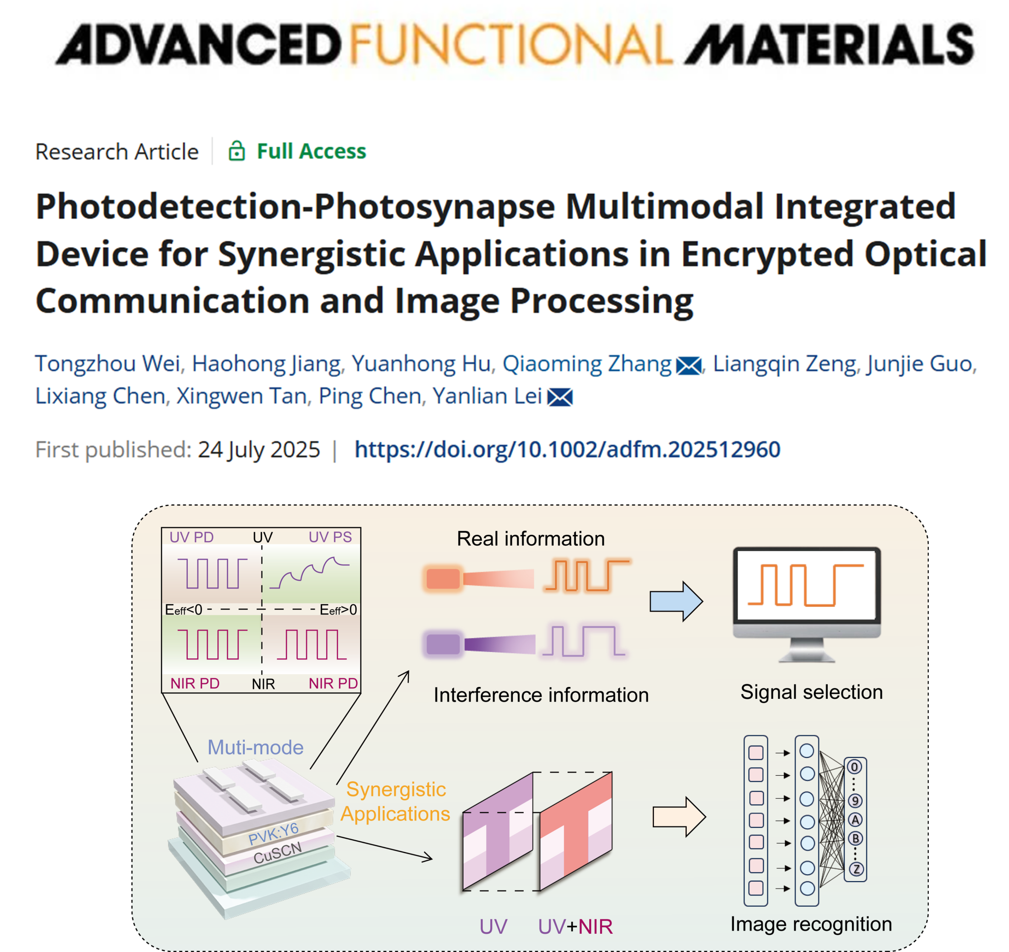 团队基于界面电荷俘获与光生载流子的可控迁移,构建了一种基于复合异质结结构(CuSCN/PVK:Y6)的多模态光电器件,在单一器件内实现了紫外探测、紫外光突触、近红外探测三种功能的无缝切换(仅需调节工作电压或激发波长即可)。该器件巧妙地将光探测和光突触间巨大响应速度差异这一功能集成瓶颈转换成二者协同应用的新范式。在光电探测中,通过频率选择光响应实现信号了加密与解密;在图像识别中,通过近红外探测模式辅助增强紫外成像,显著提升低照度目标识别精度。该成果可为多模态光电器件的集成设计以及神经形态视觉系统提供了一种紧凑、低功耗、功能可重构的硬件雏形。相关结果以“Photodetection-Photosynapse Multimodal Integrated Device for Synergistic Applications in Encrypted Optical Communication and Image Processing”为题发表在《Advanced Function Materials》(e12960, 2025)上,大发快三 2023级硕士研究生魏同舟为该论文的第一作者,雷衍连和张巧明副教授为通讯作者,大发快三-大发快三平台-大发快三官网 (微纳结构光电子学重庆市重点实验室)为唯一完成单位。