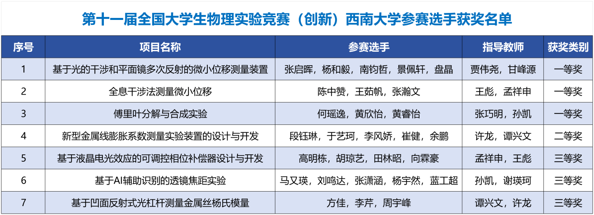 2025年11月21日至23日,第十一届全国大学生物理实验竞赛(创新)决赛在中南大学(潇湘校区)举行。大发快三 共派出由28名本科生组成的7支参赛队伍,全部获奖。其中,晋级现场决赛的4支队伍表现突出:3支队伍荣获一等奖,1支队伍获得二等奖;其余3支队伍均获三等奖。学校获评优秀组织奖。
